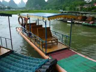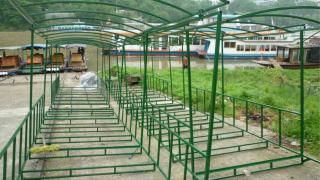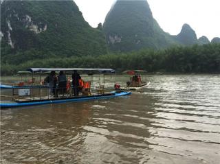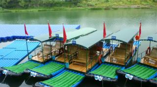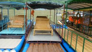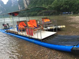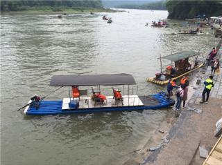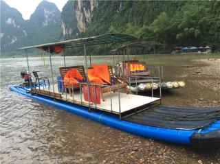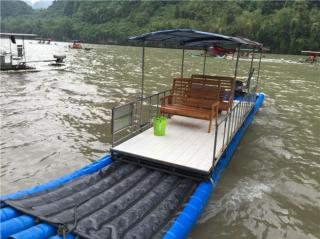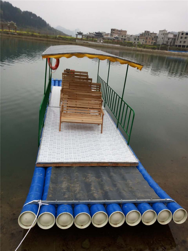 筏子采用8根直徑20厘米高強(qiáng)度PVC塑料管并排制成(管壁厚5.5毫米,普通管一般是2-3毫米左右的厚度)排身均采用扁鋼,不銹鋼扎成(超級(jí)耐用),不像以前用鐵絲扎的。離筏面5公分高的地方是一層木地板,竹筏兩旁有約80公分高的護(hù)欄,蓬面是雙層遮陽(yáng)蓬,可遮陽(yáng)隔熱非常愜意。