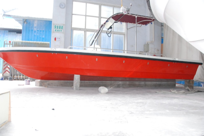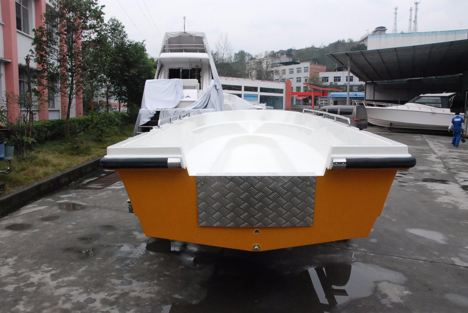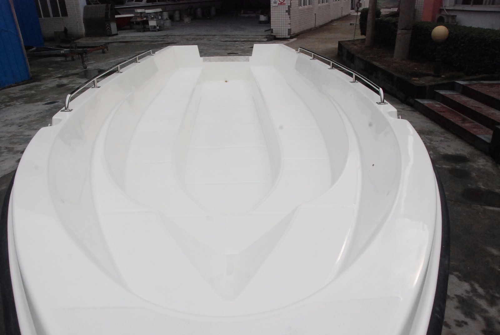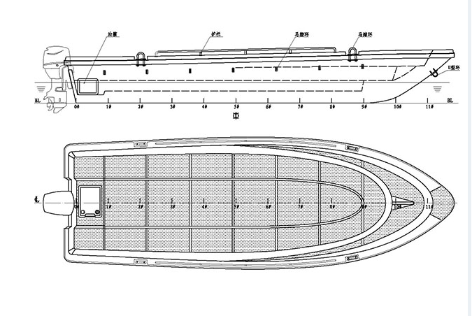 本艇為全玻璃鋼結(jié)構(gòu)、用模具整體成型的單板結(jié)構(gòu)舷外推進(jìn)的高速艇。結(jié)構(gòu)設(shè)計按《內(nèi)河高速船入級與建造規(guī)范》(2002)設(shè)計。穩(wěn)性、抗沉性符合本規(guī)范對B級航區(qū)的航行要求。設(shè)計乘員定額為12人。本艇采用舷外掛機推進(jìn),配置E40JMH手操式舷外掛機1臺,主機配套手提式塑料油箱25升1個,置于0#-1#肋位左舷。本艇采用手操式舷外掛機一臺。由駕駛?cè)藛T手操舷外掛機轉(zhuǎn)動以及推進(jìn)器的轉(zhuǎn)向,以達(dá)到自由、安全、可靠的使艇前進(jìn)、倒退和艇體的轉(zhuǎn)向。在額定功率下航速可達(dá)40Km/h。