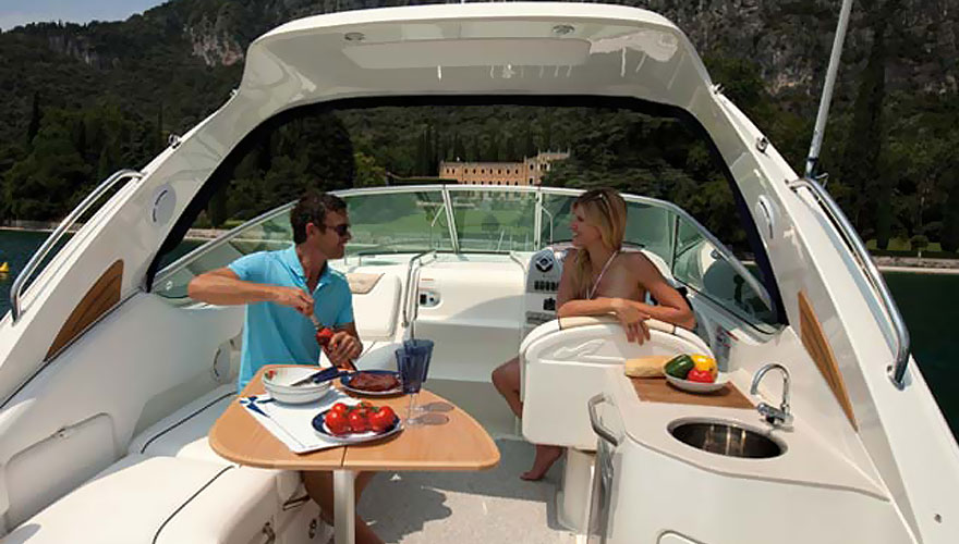 305 Sundancer是硬頂式的運(yùn)動艇。對船主來說能更好的應(yīng)對天氣變化,無縫設(shè)計的擋風(fēng)玻璃有著驚人的能見度。