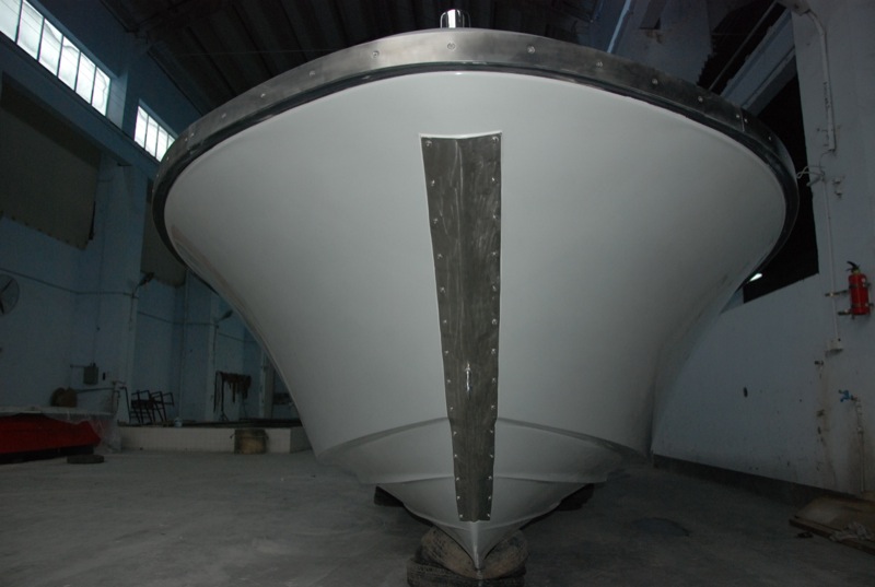 本艇為手糊成型的全玻璃鋼制高速艇,采用舷外掛機(jī)推進(jìn),本艇不夜航.本艇采用舷外機(jī)推進(jìn),配置150馬力舷外機(jī)2臺(tái)(或300馬力機(jī)一臺(tái)),燃油箱200升,置于1#+330-3#+80肋位之間。起動(dòng)電瓶采用蓄電池供應(yīng),電壓12V,電容量為70Ah。本艇采用的舷外機(jī)是電啟動(dòng)前操式的。由駕駛臺(tái)直接操縱發(fā)動(dòng)機(jī)的倒、順停、油門(mén)和舷外機(jī)的啟動(dòng)以及推進(jìn)器的轉(zhuǎn)向,以達(dá)到自由、安全、可靠的使艇前進(jìn)、倒退和艇體的轉(zhuǎn)向。駕駛臺(tái)上配有必要的操縱儀表和發(fā)動(dòng)機(jī)的儀表。在使用功率下航速可達(dá)45。
