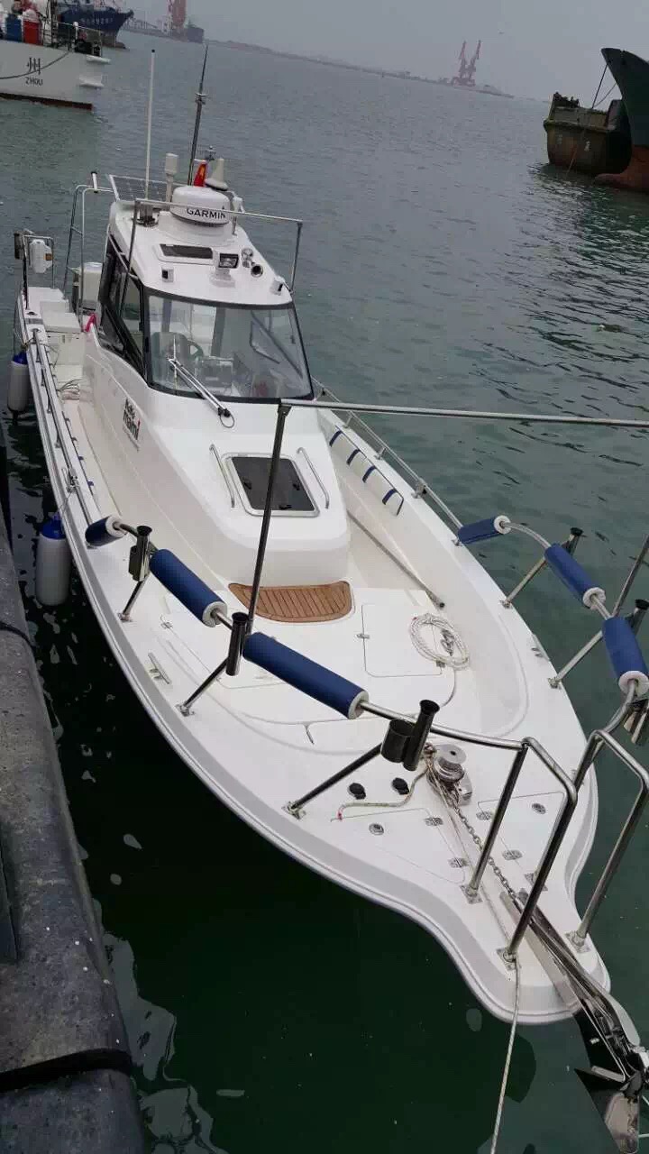 本艇為全玻璃鋼結(jié)構(gòu)、用模具整體成型的單板結(jié)構(gòu)舷外推進(jìn)的高速艇。穩(wěn)性、抗沉性符合本規(guī)范對(duì)B類航區(qū)的航行要求,本艇不夜航。本艇采用舷外機(jī)推進(jìn),配置150Hp舷外機(jī)2臺(tái),燃油箱250升1個(gè)。起動(dòng)蓄電池采用電壓12V,容量為80Ah×2塊,主機(jī)運(yùn)轉(zhuǎn)時(shí)充電機(jī)對(duì)蓄電池進(jìn)行充電。本艇采用的舷外機(jī)是電啟動(dòng)前操式的。由駕駛臺(tái)直接操縱發(fā)動(dòng)機(jī)油門和舷外機(jī)的轉(zhuǎn)動(dòng)以及推進(jìn)器的轉(zhuǎn)向,以達(dá)到自由、安全、可靠的使艇前進(jìn)、倒退和艇體的轉(zhuǎn)向。駕駛臺(tái)上配有必要的操縱儀表和發(fā)動(dòng)機(jī)的儀表。在使用功率下航速可達(dá)65Km/h。