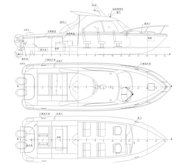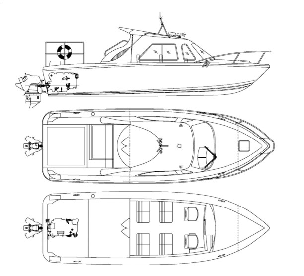 本艇采用舷內(nèi)外機(jī)推進(jìn),配置ME372STI123Kw舷內(nèi)外機(jī)1臺(tái),燃油箱243升1個(gè),置于3?!?/span>4#肋位之間。起動(dòng)蓄電池采用電壓12V,容量為80Ah×2塊,置于0?!?/span>1#肋位左右舷。本艇采用意大利助力式液壓操舵系統(tǒng),左舷至右舷可操舵角度為70°此操舵系統(tǒng)與主機(jī)配套使用。本艇采用舷內(nèi)外機(jī)電啟動(dòng)前操式,由駕駛臺(tái)直接操縱發(fā)動(dòng)機(jī)油門(mén)和舷內(nèi)外機(jī)的轉(zhuǎn)動(dòng)以及推進(jìn)器的轉(zhuǎn)向,以達(dá)到自由、安全、可靠的使艇前進(jìn)、倒退和艇體的轉(zhuǎn)向。駕駛臺(tái)上配有必要的操縱儀表和發(fā)動(dòng)機(jī)的儀表。在使用功率下航速可達(dá)40Km/h。