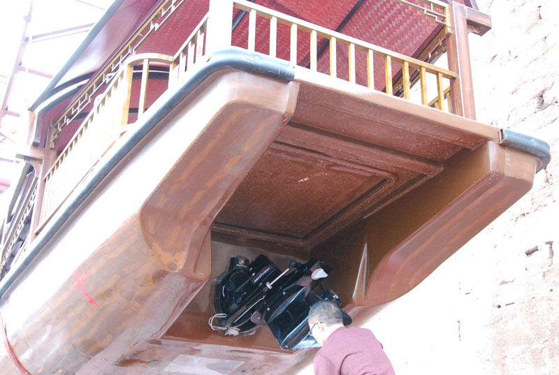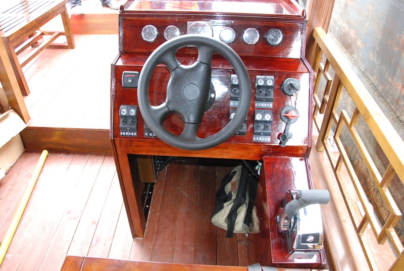 本艇為全玻璃鋼結(jié)構(gòu)、用模具整體成型的單板結(jié)構(gòu)舷內(nèi)外推進(jìn)的低速艇。穩(wěn)性、抗沉性符合本規(guī)范對C級航區(qū)的航行要求,本艇不夜航。本艇采用舷內(nèi)外機(jī)推進(jìn),配置270Hp舷內(nèi)外機(jī)1臺,燃油箱100升1個(gè),燃料為柴油。起動蓄電池采用電壓12V,容量為60Ah×2塊,主機(jī)運(yùn)轉(zhuǎn)時(shí)充電機(jī)對蓄電池進(jìn)行充電。本艇采用的舷內(nèi)外機(jī)是電啟動前操式的。由駕駛臺直接操縱發(fā)動機(jī)油門和舷外機(jī)的轉(zhuǎn)動以及推進(jìn)器的轉(zhuǎn)向,以達(dá)到自由、安全、可靠的使艇前進(jìn)、倒退和艇體的轉(zhuǎn)向。駕駛臺上配有必要的操縱儀表和發(fā)動機(jī)的儀表。在使用功率下航速可達(dá)12Km/h