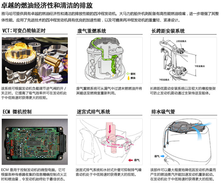 4沖程:雅馬哈可提供具有卓越的燃油經濟性和清潔的排放性能的四沖程發(fā)動機。大馬力的船外機則配備有高性能燃油噴嘴,進一步增強了其整體性能。應用了先進技術的四沖程發(fā)動機具有優(yōu)良的加速性能,以及可媲美兩沖程發(fā)動機的重量輕、緊湊設計。